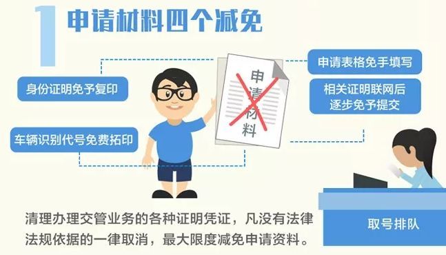 1、申请材料四个减免。办理交管业务时,申请人身份证明免予复印,申请表格免手填写,车辆识别代号免费拓印,车辆购置税、交强险、体检证明等相关部门证明凭证实现联网后逐步免予提交。