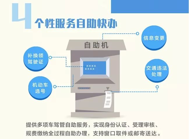4、个性服务自助快办。推广使用自助服务终端,群众可自助办理补换领驾驶证、机动车选号、信息变更、交通违法处理等业务。
