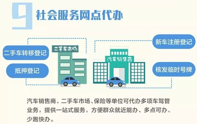 9、社会服务网点代办。推行登记服务站代办,由汽车销售商、二手车市场、保险等单位代办新车注册登记、二手车转移登记等车驾管业务,提供购车、选号、投保、缴税等“一站式”服务。