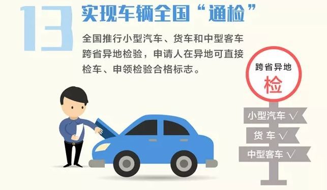 13、实行车辆全国“通检”。2018年9月1日起,全面推行小型汽车、货车和中型客车跨省异地检验,申请人可以直接在机动车登记地以外省份直接检验,申领检验合格标志,无需办理委托检验手续。